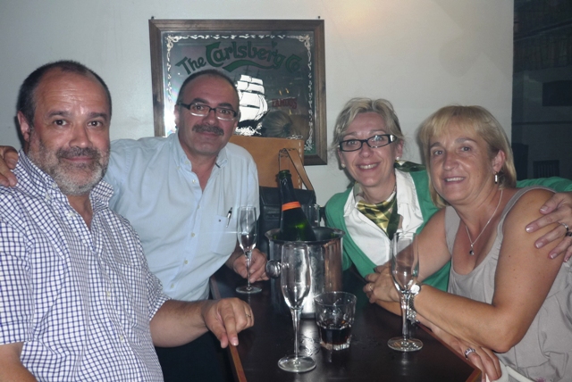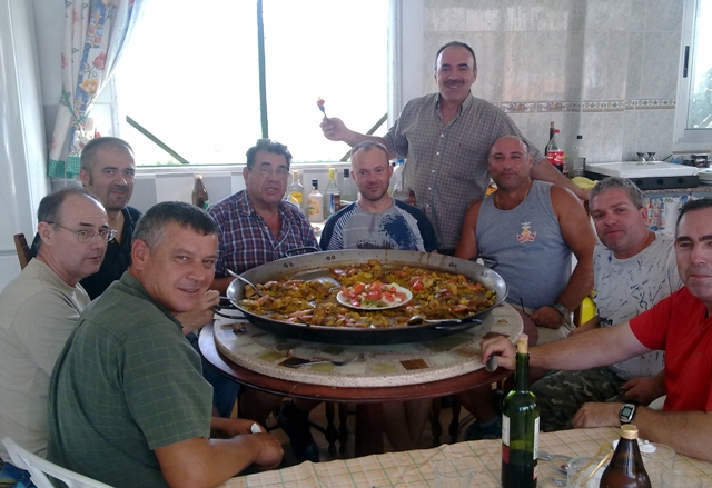| 20.- Campeonato de Europa 2011 Hamina-Finlandia. María Jesús, Cris y Claudia vestidas para la cena de clausura, que se realizó en el mismo "bastión". | 5.- "Paelleta" en la "caseta" de Juan Esteban. Rafa, Ramonet, Rosell, Frigola, Alejandro, Galán, Font, Esteban y Paco. | |