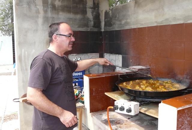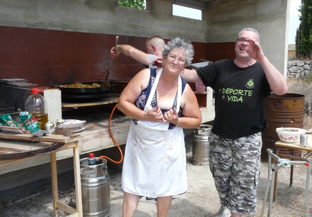 | 4.- Rosa, la encargada del salón social del Club, junto con Juan Esteban y Alejandro, preparando las paellas. | 5.- El autor de "postureo". Alguien por detrás le dice lo que tiene que hacer. | |