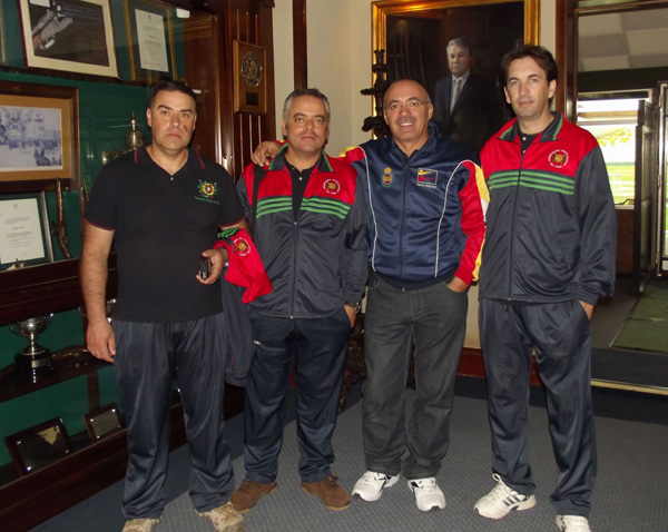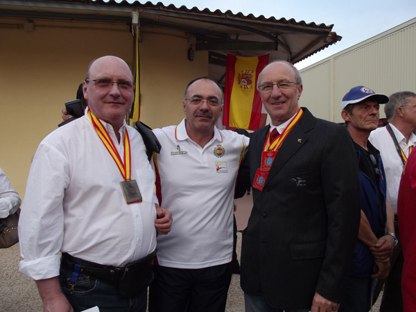 Izq. 53.- Con dos de los tiradores franceses que más admiro y me congratulo de contar con su amistad, Philippe Journet y Guy Cozzoli. Der. 54.- Grand Prix MLAIC "Príncipe de Asturias", Canto Blanco-Madrid. Con los amigos portugueses Carlos Santos, Joao Faria y Adelino Rocha. Los llevé a visitar la colección de armas de Arturo en la cancha de plato. |