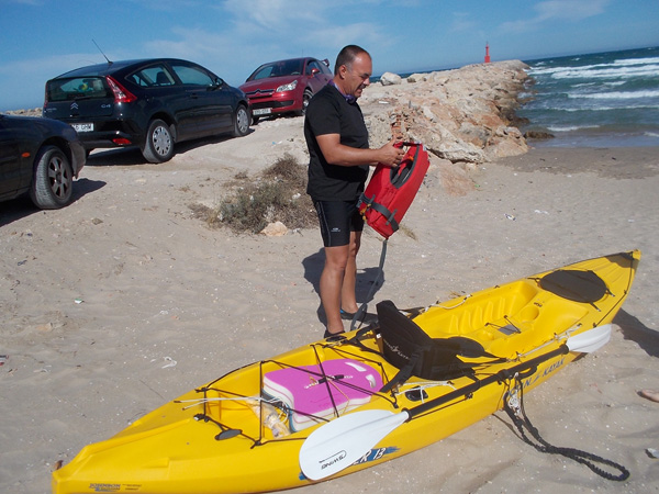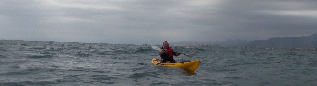 68.- Disfrutando de una magnífica jornada de kayak por la bahía de Cullera con el cielo cubierto y el mar algo revuelto, interesante. |