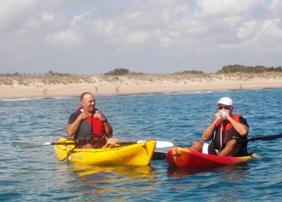 Izq. 71.- La foto de familia no debe faltar nunca. La tropa al completo. Der. 72.- Jornada de kayak con el amigo Javier que hace sonar la caracola tratando de que acudan las sirenas. Nunca lo consigue. |
