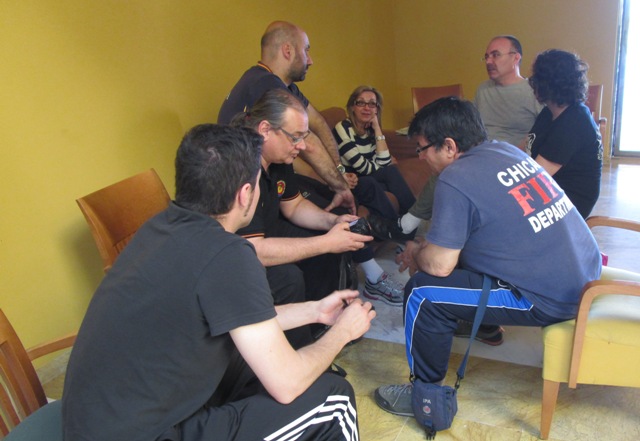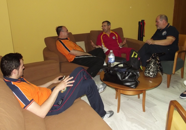 Izq. 17.- Campeonato de España de AH en el CEAR de las Gabias-Granada. Relajada sesión de entrenamiento a 100 m. el jueves, día previo al inicio del campeonato. Der. 18.- Campeonato de España de AH en el CEAR de las Gabias-Granada. Tertulia repaso de sensaciones en la sala de descanso. |