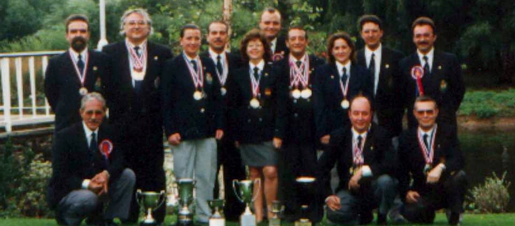 1.- Equipo representante español en el Campeonato del Mundo MLAIC de 1996 disputado en Warwick-Inglaterra. Foto de grupo con José Muñoz, José Luis Pérez Pastor, Dolores Vázquez, José Triquell, Nunci Rodríguez, Joaquín Méndez, Emilio Ramos, Puri Fernández, Juan Ramón Alonso, José Ramón Galán, Eduardo Fernández, Lisardo García y Manuel Astudillo. |