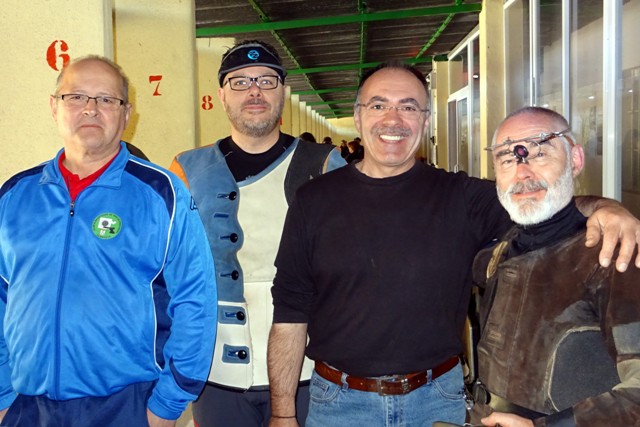 Izq. 52.- Triangular "Arcabuceros Sureste" en Cullera. Con José Luis Pérez Pastor y José Andréu, mis maestros de siempre. Der. 54.- Triangular "Arcabuceros Sureste" en Cullera. Vicente, Mikel, Galán y Manuel. Con Manuel creo que comparto toda una vida de tiro, y en ocasiones podios. |