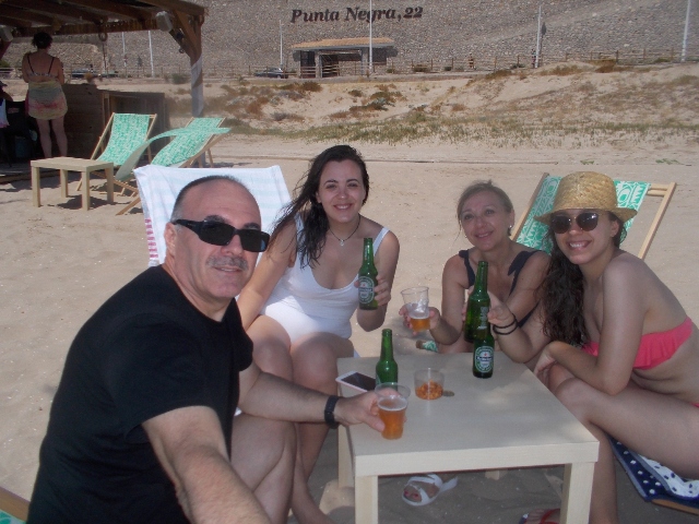 Izq. 12.- Campeonato Autonómico 100 m. en Elda-Alicante. Claudia, Pascui, Andréu y Jesús que ejercía de árbitro. Der. 13.- Día de playa en el Faro de Cullera. Refresco después del baño. |