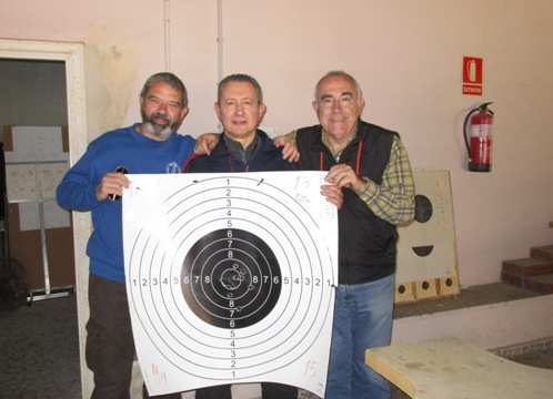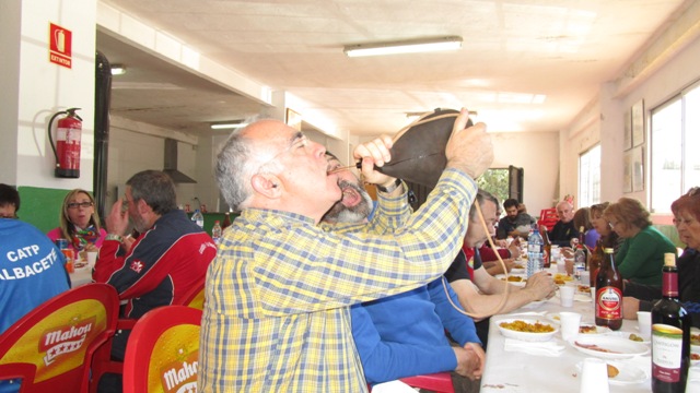 Izq. 18.- Triangular "Arcabuceros Sureste" en Cullera. José María Ibáñez se marcó un 97 en Miquelet, que revalidaría en el Campeonato de España. Pedro y Jesús le acompañan en la imagen. Der. 19.- Triangular "Arcabuceros Sureste" en Cullera. Pedro "apretando" la bota durante la comida social. |