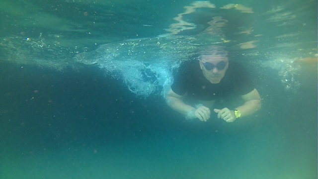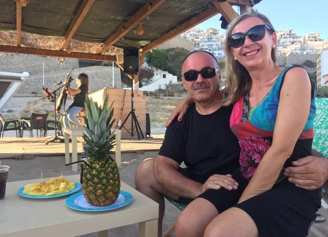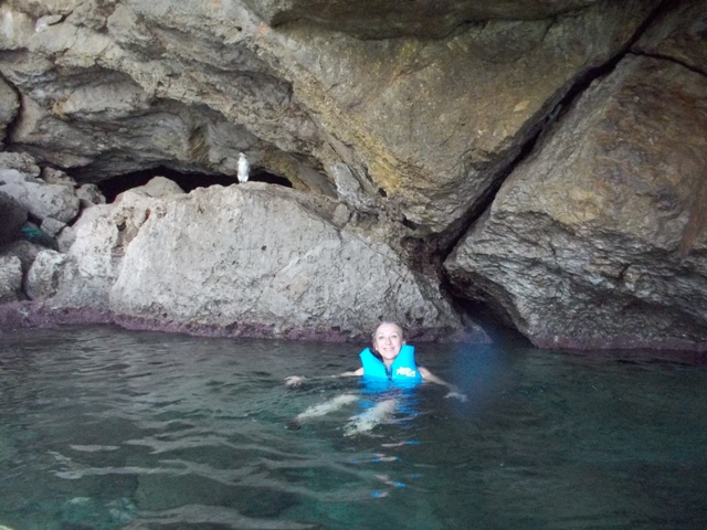 Izq. 45.- Una piña colada a pie de playa y con música en directo. Pequeños placeres ahora tenemos menos obligaciones. Der. 46.- Claudia flotando en las cristalinas aguas del interior de la cueva del Dragut. Con un cormorán como testigo mudo. |
