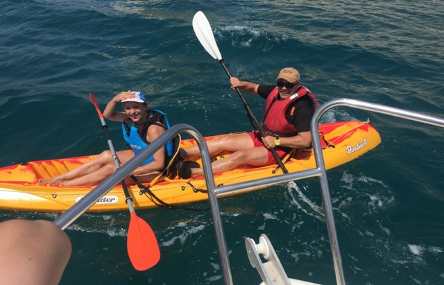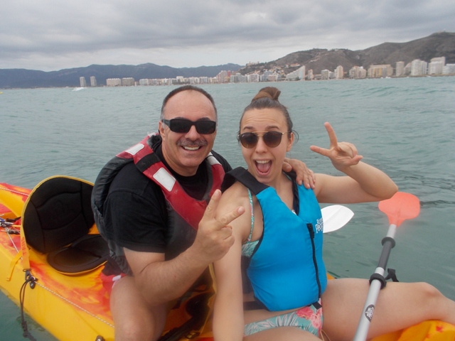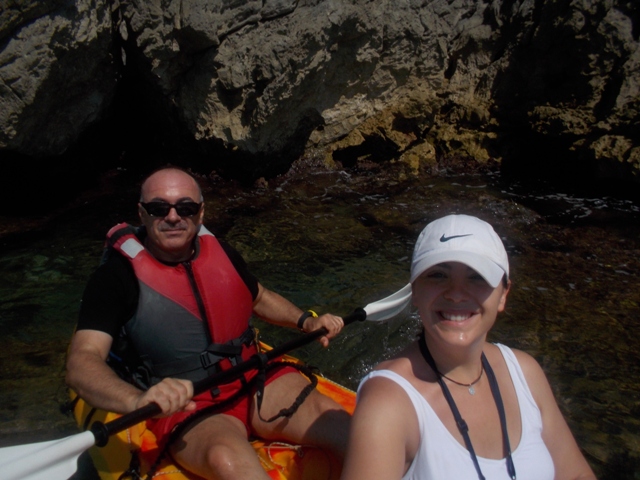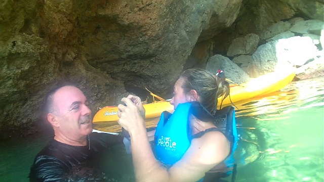 Izq. 41.- No vamos a colisionar, hemos quedado con unos amigos para bañarnos frente a los acantilados del Faro de Cullera, nuestra zona de recreo habitual. Der. 42.- Jornada de kayak con Claudia hija y de nuevo disfrutamos de uno de esos días, escasos, en que pudimos bañarnos en el interior de la cueva del Dragut. |