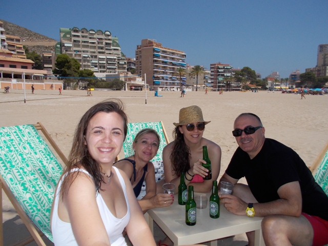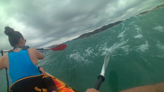 Izq. 43.- Día de playa en familia. Refresco al mediodía antes de la comida. Der. 44.- Durísima jornada de kayak con Marta, finalmente ganó el mar y tuvimos que salir lo más elegantemente que pudimos. Oleaje tremendo. |