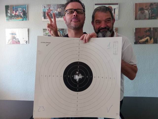 Izq. 47.- Campeonato de España de AH en el CEAR de las Gabias-Granada. Las Walkyrias a punto de comenzar su competición. Claudia se impuso por tercer año consecutivo. Estaba tan contenta que casi no se lo creía. Der. 48.- Triangular "Arcabuceros Sureste" en Alicante. Jesús Olivares y Mikel Cuartero. Este último se impuso en la prueba de Vetterli con un espectacular 100, y lo mejor de todo es que lo consiguió con su fusil militar, el mismo que empleara después en la prueba de Lamarmora. |