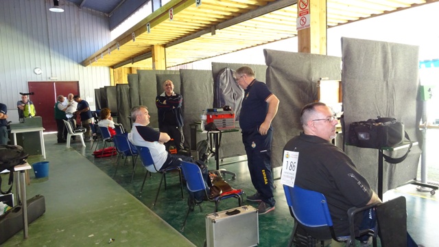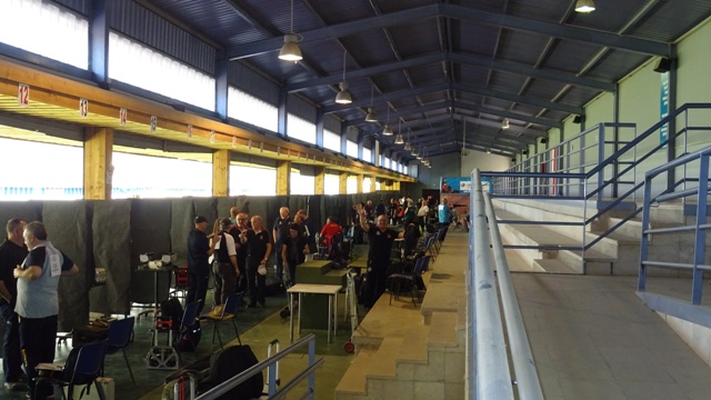23.- Control de armas en la sala baja del CEAR de Granada. Campeonato de España 2019. 24.- Campeonato de España 2019 disputado en el CEAR de Granada. Vista general de la cancha de 25-50 m. momentos antes del comienzo de una de las entradas. |