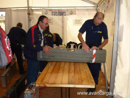 El policía de aduanas comprobando y