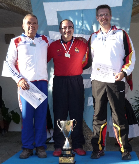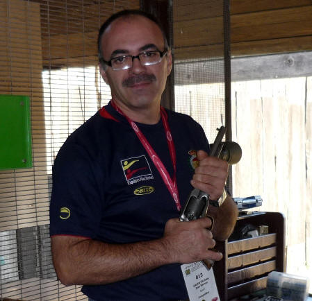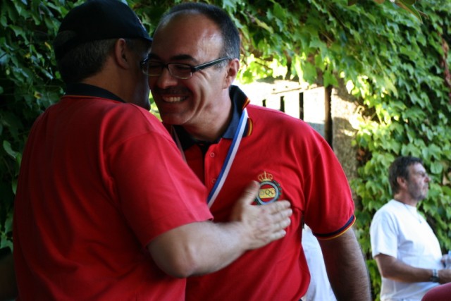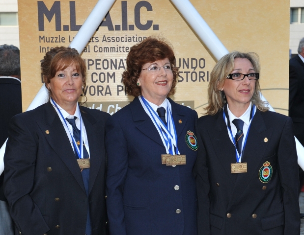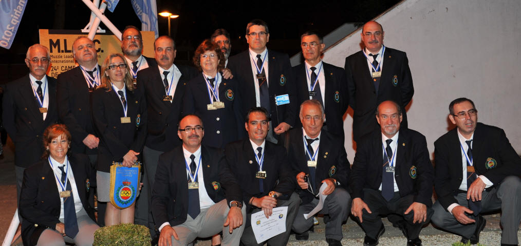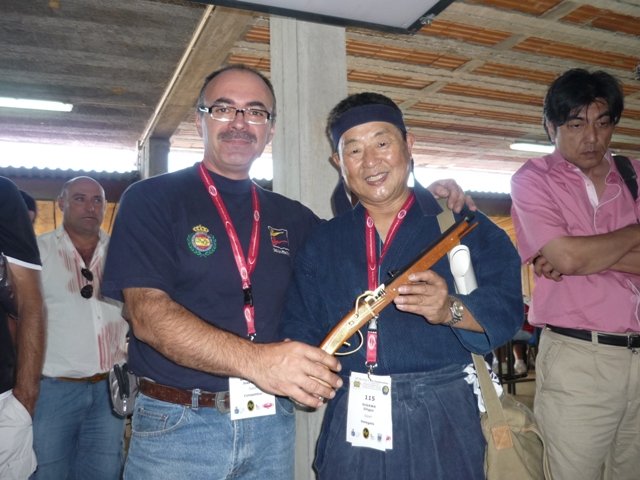 Lo mejor de este año, ha sido contar entre el equipo japonés con el mayor experto en armas de mecha de origen nipón, Sigeo Sugawa, autor del “The Japanese Matchlock” y al que acosé con múltiples preguntas sobre este tipo de armas que me apasionan. Llegamos a desmontar, incluso, una pistola Tanzutsu de ARSA, de fabricación española, para argumentar nuestra charla. Fue para mi un honor poder departir un momento con este gran maestro que atesora tantos conocimientos sobre todo tipo de armas de mecha, incluso europeas. El desfile inaugural por las calles de la histórica ciudad de Barcelos, martes día 17, dio paso a las competiciones. Muchas ilusiones y toda una temporada de preparación que acabaría con la selección de los mejores en cada disciplina. Hubo pocas sorpresas, el equipo alemán, francés e inglés destacaron por encima de todos, también su disciplinado comportamiento. En lo que se refiere al equipo español, y aunque el medallero ha sido bueno, no podemos esconder que esperábamos más. El alto número de tiradores convocados, todos ellos con marcas acreditadas y posibilidades de medalla, nos hizo confiar en un mejor medallero. Las otrora medallas en que se fundamentaba el regular conjunto español, las de equipos, han fallado en su mayoría, si exceptuamos la de Hawker (plato) en la que todos los tiradores han estado bien, siendo el único oro por equipos. Afortunadamente las medallas individuales no fueron tan remisas, aunque podrían haber sido más si la diosa fortuna se hubiera puesto de nuestro lado, y brillaron con luz propia los siguientes tiradores: José Miguel Triquell Val. Oro en Maximilian original (rifle de chispa 100 mts) con 88 puntos sobre 100 posibles. Un buen resultado para una difícil especialidad, que aúna la precaria balística de los proyectiles esféricos para el tiro de precisión a larga distancia, con la dificultad de encontrar rifles de chispa originales en buenas condiciones de tiro. Pepe empleó en este caso, un rifle centroeuropeo de tipo Jäger firmado por Kuchenreuter de calibre .54 que tiene una precisión aceptable y regular con una carga de 75 grain de Suiza Nº2. Realizó una sesión de entrenamiento en horario distinto al que le correspondía la competición, por lo que considera que se encontró con unas condiciones ambientales distintas, “con el horario de las 9 de la mañana y el puesto nº 1 que me correspondió, el sol me daba en la cara directamente. Puede defenderme, relativamente bien, atrasando a tope mi posición en el puesto”. Pepe está especializado en las disciplinas de precisión a 100 metros, donde obtiene resultados tan excepcionales como el oro conseguido. José Vicente Patiño Lillo. Oro en Cominazzo original (pistola de chispa) con 89/100 puntos. Empleó para la ocasión una pistola Mortimer original de calibre .45 con la que ya ganara el campeonato de España. La carga empleada fue la de 40 grain de pólvora Suiza del Nº2 y en la llave una piedra de ágata con el filo hacia arriba, “utilizo piedra de ágata blanca con el borde cortante hacia arriba. En competición, hago con una cara el disparo de limpieza más otros seis de competición y con la otra cara los siete restantes”. Cominazzo es la modalidad en que se ha especializado el amigo Josep, como lo demuestra la posesión del actual récord nacional de esta disciplina en la variante de réplica (Mallorca 2004) con 97 puntos, una marca casi imposible de igualar. José Ramón Galán Talens. Oro en Cominazzo réplica (pistola de chispa) con 94/100 puntos, y bronce en Pennsylvania réplica (rifle chispa 50 metros) con 96/100 puntos. El autor de este trabajo es un apasionado del tiro, y había preparado muy bien sus entrenamientos para lograr el momento óptimo durante la época del campeonato. Dos medallas y dos diplomas de 5º no son un mal resultado si tenemos en cuenta la rivalidad existente y el nivel deportivo de la mayoría de participantes. El oro lo conseguí con una pistola réplica Manton de ARSA, fabricada en España. Cargo con 40 grain de Suiza Nº1. Tuve problemas desde el mismo comienzo de la prueba. En un principio montaba una piedra de sílex francés de color caramelo (Dutrieux), que tuve que substituir al segundo disparo por otra similar que no aguantó mas que un defectuoso disparo, para acabar montando de forma definitiva una de Jaspis verde con la que realmente hice la tirada (5-10s, 4-9s y 1-8), pues los tres primeros disparos fueron los de peor resultado y por tanto los que se descontaron. El bronce lo obtuve con la réplica de un rifle centroeuropeo del tipo Jäger fabricado artesanalmente por D. Jesús Mari Araquistain de ARSA. Es un rifle equilibrado y de buen comportamiento con el que ya consiguiera la plata en el pasado europeo 2009 con la misma marca de 96 puntos. En este campeonato y tras comenzar la prueba con dos buenos disparos, sufrí una pequeña avería en la llave que me restó un tiempo vital, añadiendo una cierta cantidad de estrés al propio de la competición, pues formaba parte del equipo y era vital terminar la prueba. Con todo ello pude finalizar con un buen número de 10s que fueron merecedores de la tercera plaza del podio José Luís Pérez Molero. Oro en Manton réplica (tiro al plato con escopeta de chispa) con 46 platos abatidos de los 50 lanzados. Con una primera serie en la que rompió 22/25, no era un mal resultado pero tampoco el mejor, puesto que algunos de sus adversarios ya tenían 23/25. Todo quedaba para la segunda serie, y será por la tarde cuando fallando uno de los platos, el 7º, y no mejorando sus rivales, se impuso claramente con 46/50. El joven Molero es un brillante y seguro tirador del equipo español. Luciano Porta Gran. Plata en Lamarmora réplica (fusil militar 50 mts) con 97/100 puntos. Emplea un Württembergischen Máuser de calibre .54 que carga con 48 Grains de pólvora Suiza Nº 2. Chano nos cuenta que realizó un entrenamiento previo, “solo como toma de contacto, si