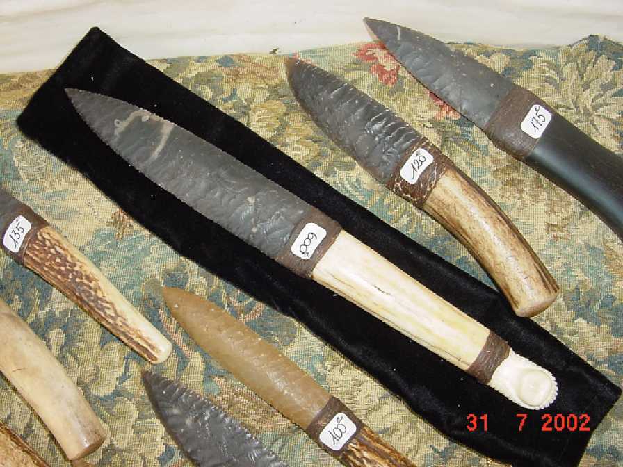 La nota curiosa la dio un tenderete montado por Jean-Jacques Dutrieux, según el mismo, el último tallador de sílex francés que existe actualmente. Pudimos apreciar el gran conocimiento que tiene sobre esta técnica y nos impresionó la facilidad con que tallaba la piedra, así como sus replicas de cuchillos prehistóricos tallados en sílex y con empuñaduras de hueso y marfil. También se dedicó a instalar sus piedras a todo el que le llevase su arma de chispa, que mejor publicidad, y verdaderamente tallaba unas piedras de mucha calidad. En las fotos que acompañan este reportaje podréis apreciar alguno de sus trabajos.