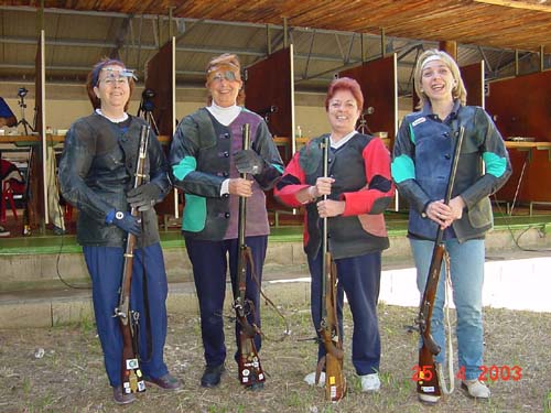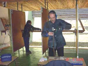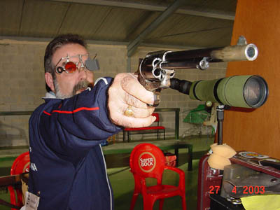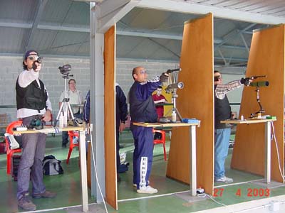 Gerardo García se alzaba con la primera plaza en la especialidad de Miguelete (mosquete militar de chispa) con una extraordinaria marca de 95 puntos, que iguala el récord de España (Juan M. Esquirol Madrid, Vitoria 1991), y que congregó tras de él a la mayor parte de los espectadores que había en aquel momento en la cancha, y es que no resulta habitual ver tanto “diez” en esta disciplina tan difícil de dominar. Con 90 puntos obtuvo la segunda plaza José Muñoz, uno de nuestros mejores y mas regulares tiradores, que arrastra actualmente una lesión desde el último Campeonato del Mundo que ha mermado ligeramente sus marcas habituales. El tercer lugar fue para José Luis Pérez Molero con 87 puntos que no le debieron satisfacer mucho, resarciéndose en Tanegashima (mosquete de mecha, posición de pie), disciplina en la que con 97 puntos se alzaba campeón igualando el récord de España (José Ramón Galán, Mataró 2002), seguido por Joaquín Gaya con 93 y Eugenio Martín con 92.