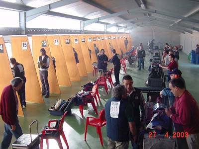 La cancha principal esta situada bajo una nave de grandes dimensiones muy bien instalada y orientada; en el centro de la misma existe una baranda que separa el espacio destinado al publico del de los tiradores, quedando en ambos lados una zona muy amplia que permite a los tiradores participantes disponer de espacio mas que suficiente para dejar sus bolsas y estuches con las armas, al tiempo que pueden moverse sin el sentimiento de agobio que se tiene en las instalaciones menos espaciosas (la mayoría). De la misma manera, el publico también puede desplazarse entre los puestos sin demasiada dificultad, pues el pasillo de 5 metros destinado a tal efecto lo permite. La mesa de carga es de altura regulable por medio de un ingenioso sistema de anilla sobre tubo rígido, que si bien resultaba muy útil, le restaba la rigidez necesaria para la carga de los revólveres, aunque esto no fue un problema importante para el normal desarrollo de la competición.