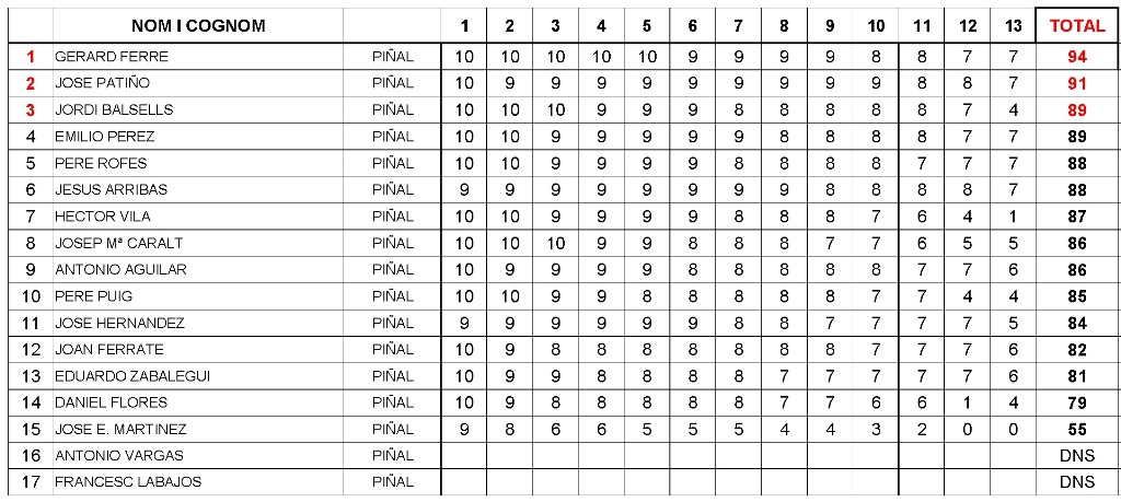 Clasificación final de la especialidad de Piñal (pistola/revolver de cartucho metálico pólvora negra): |