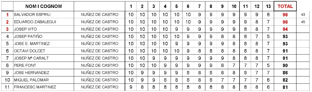 Clasificación final de la especialidad de Núñez de Castro (rifle de cartucho metálico pólvora negra): |