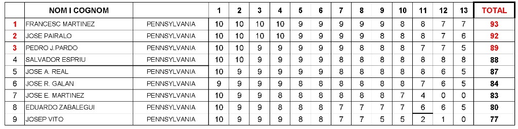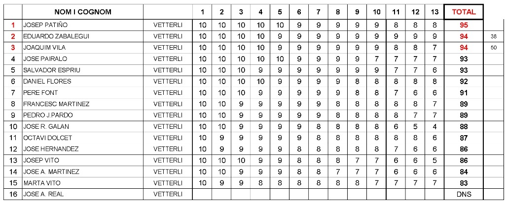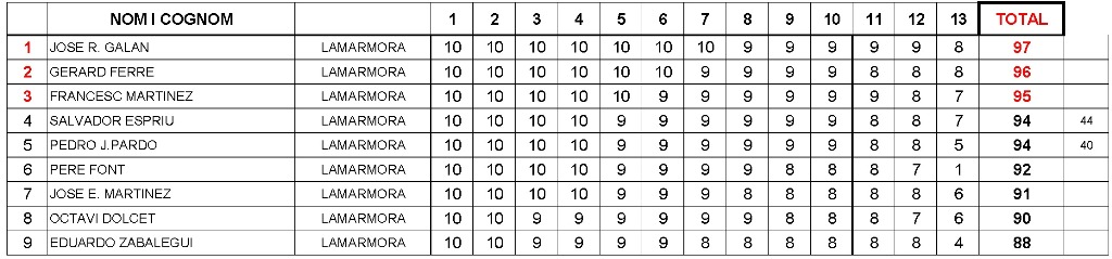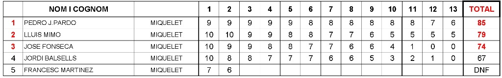 Clasificación final de la especialidad de Miquelet (mosquete militar de chispa): |
